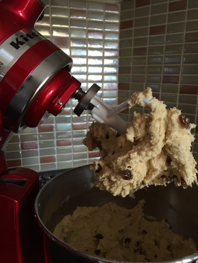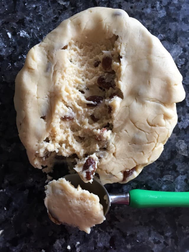 - Hamur halini alana kadar yoğurun ve son olarak kuru üzümleri ekleyin.