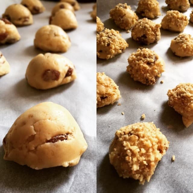 - Dondurma kaşığı ile hamurdan parçalar alıp şekillendirin ve önce yumurta akına sonra cevize bulayıp yağlı kağıt serilmiş fırın tepsisine dizin. ( dondurma kaşığınız yoksa elinizle yuvarlak şekli verin)