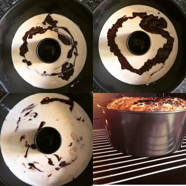 - Kek harcı fazla olduğundan kek kalıbınız büyük olmalı. Kalıbınızı katı yağ ile yağlayıp önce sade hamurdan sonra kakaolu hamurdan olacak şekilde sırayla dökün. Kabarcıkların sönmesi için tezgaha birkaç kez vurun.