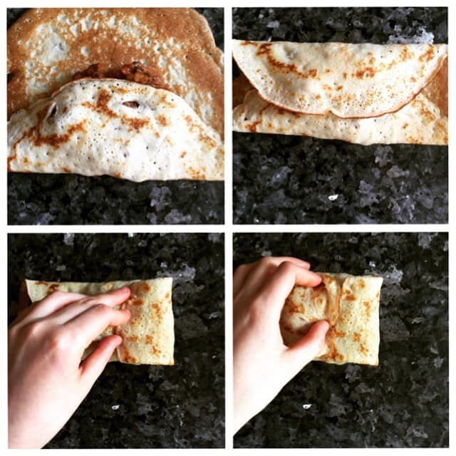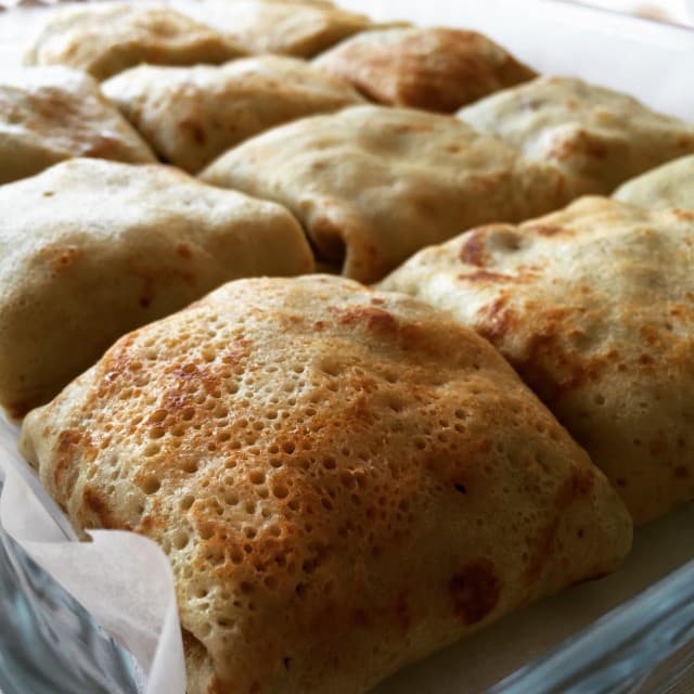 - Pişen kreplerin ortasına etli harçtan koyarak kare olacak şekilde kapatın. Ters çevirip yağlı kağıt serilmiş fırın kabına dizin.