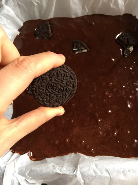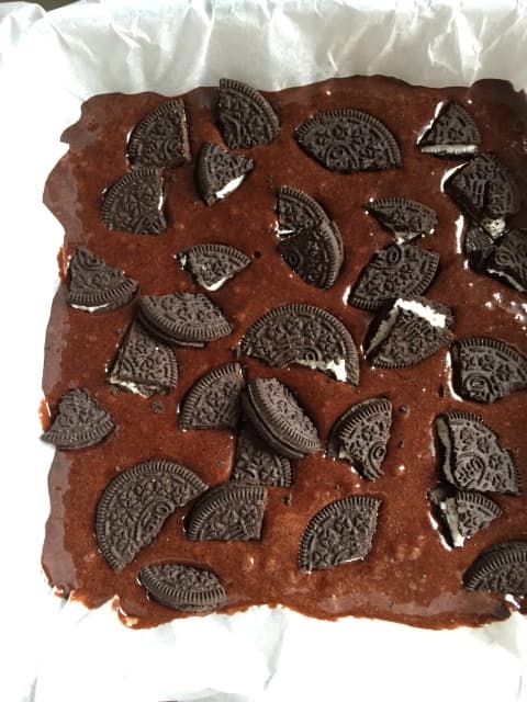 - Yağlı kağıt serilmiş kare borcama harcı yayın. Üzerine elinizle kırdığınız oreoları ekleyin. 180 derecelik fırında 30 dk pişirin.