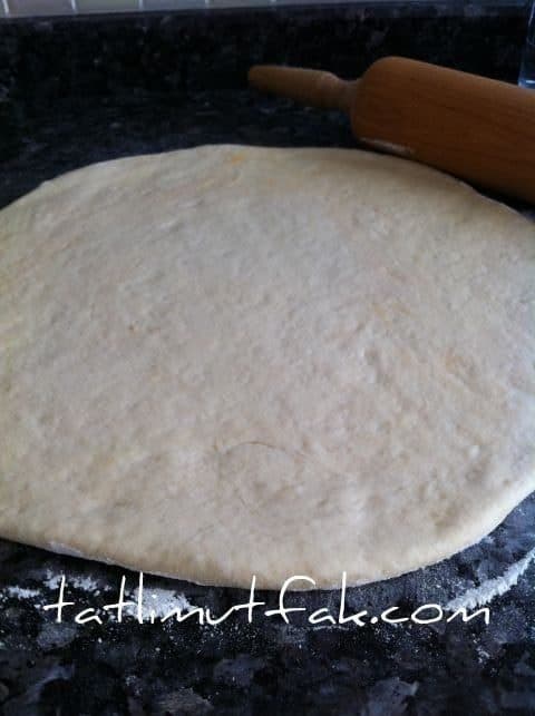 - Hamur dinlendikten sonra yuvarlak şekilde açın ve yağlı kağıt serilmiş fırın tepsisine ( evinizde varsa pizza tepsisi) yerleştirin.