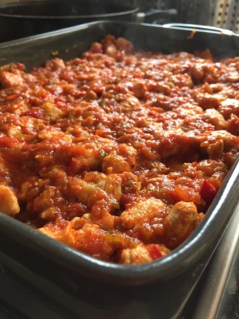 - Tavuklu harç için, soğanları doğrayıp sıvıyağ eklediğiniz tencerede kavurmaya başlayın. Soğanlar kavrulunca ince doğradığınız sarımsakları ekleyin ve kavurmaya devam edin. Ardından küp küp doğranmış tavukları da ekleyerek karıştırın. Tavuklar pişince küp küp doğranan domates ve biberleri de ekleyin. Biraz kavurduktan sonra domates salçası ve verilen baharatlarını ekleyin. Bir süre daha kavurduktan sonra ocaktan alın.