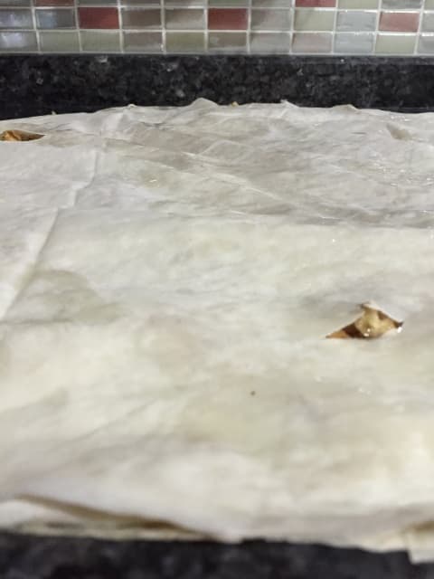 Yufkaları tek tek yağlayıp ceviz serpiyorsunuz
