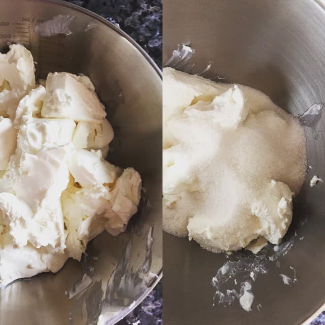 Oda sıcaklığındaki krem peynirler ile şekeri çırpma kabına alıyorum ve güzelce çırpıyorum,