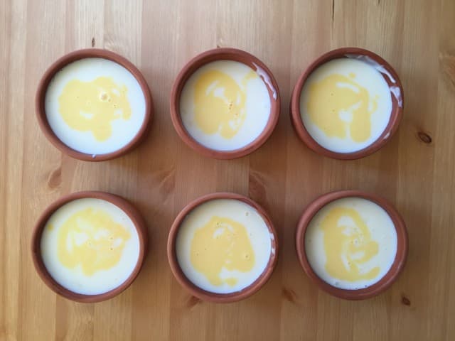 - 2 adet yumurta sarısını ufak bir kaseye koyun ve içine bir kepçe sütlaç harcından alıp karıştırın.