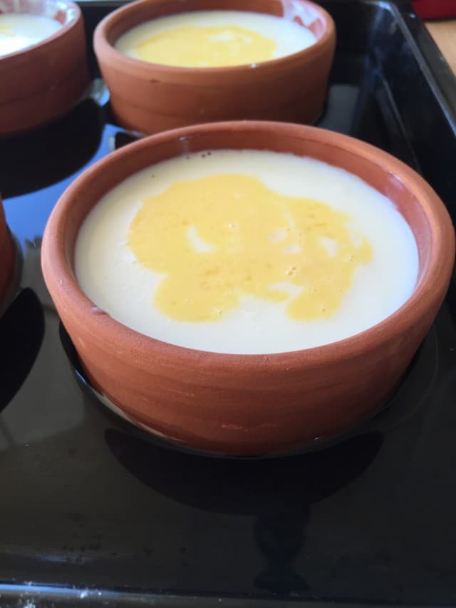 - Hazırladığınız sütlaçları ısıya dayanıklı kaplara paylaştırın. Üzerlerine yumurtalı karışımdan sürüp biraz pudra şekeri serpin.