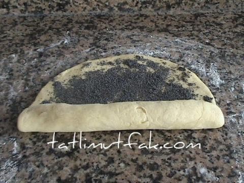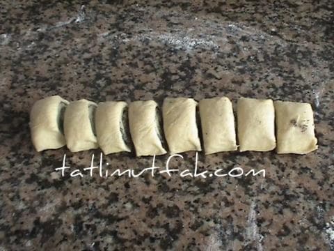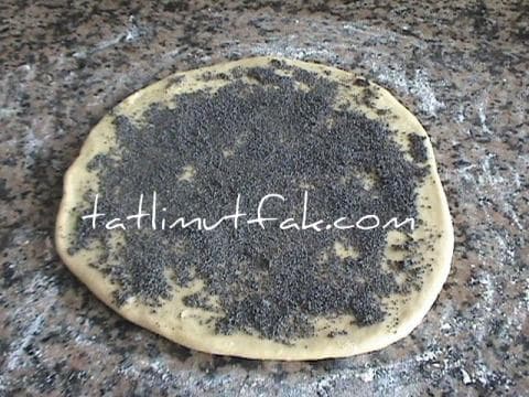 - Hamur mayalandıktan sonra eşit şekilde 2\’ye bölün. İlk parçayı alıp ince olmayacak şekilde açın. Haşhaşlı karışımı hamura sürüp, iyice yayın. Daha sonra rulo gibi kıvırın ve iki parmak kalınlığında kesin. Kestiğiniz parçaları elinizde veya tezgahta düz çevirip üzerine basın. Tepsiye dizin. İlk parçayı bu şekilde hazırlayın. Eğer ikinci parçayla da haşhaşlı yapacaksanız aynı yöntemleri uygulayın. Kalan haşhaşlı karışımıda poğaçaların üzerine sürün.