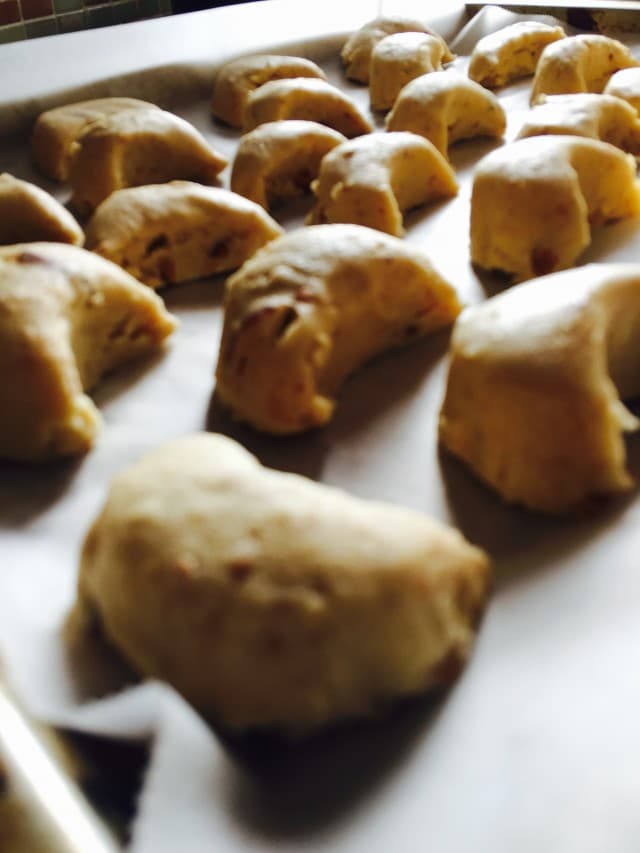 - Hamuru tezgaha alıp 1,5 cm kalınlığında açıp şekil verin ve yağlı kağıt serilmiş tepsiye dizin.