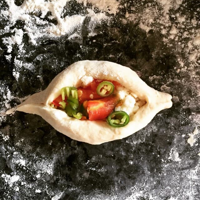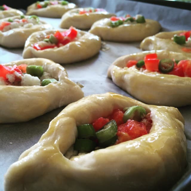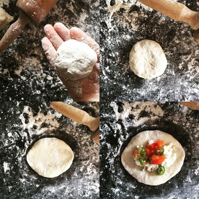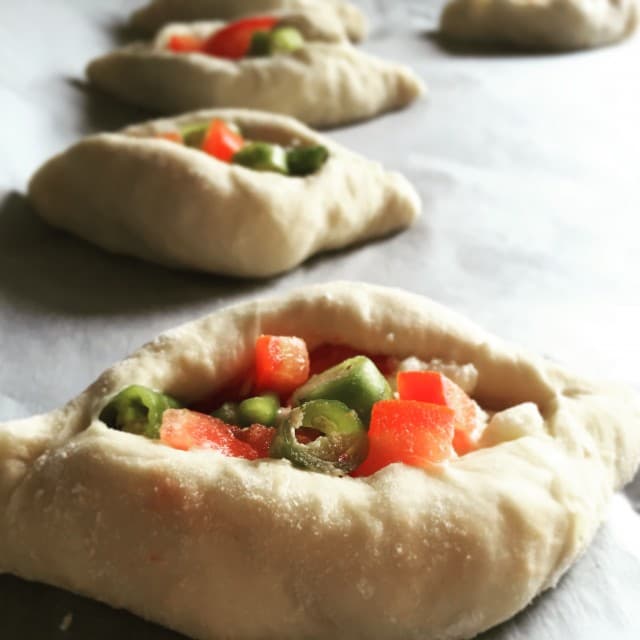 - Dinlenen hamurdan ufak bezeler alıp fotoğraftaki şekilde açın ve içine iç malzemesinden koyarak yanlarını kapatın. (isteyenler kekik veya pulbiber de serpebilirler) Bütün hamuru bu şekilde hazırlayın.