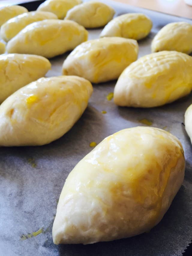 - Ayırdığınız yumurta sarısının içine bir tutam pudra şekeri ekleyerek karıştırın ve poğaçaların üzerine sürün. Çatalla üzerine çizikler atın ve 5 dk daha mayalandırın.