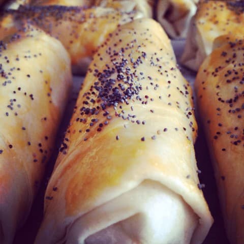 - Yağlı kağıt serilmiş fırın tepsisine börekleri yerleştirin. Üzerine yumurta sarısı sürüp haşhaş serpin. Önceden ısıtılmış 180 derecelik fırında pişirin.