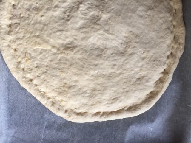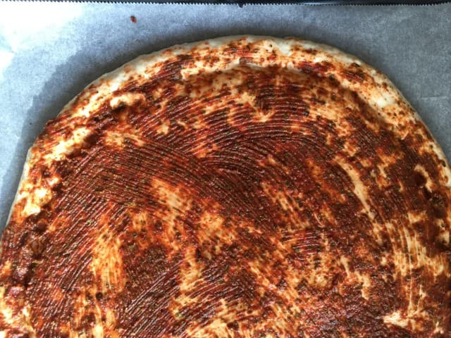 - Dinlenmiş ve kabarmış olan hamurunuzu hafif unladığınız tezgahta yuvarlak olacak şekilde açın. Yağlı kağıt serilmiş fırın tepsisine yerleştirin. Üzerine hazırladığınız sosu yedirin. Verilen malzemeleri de ekleyin.