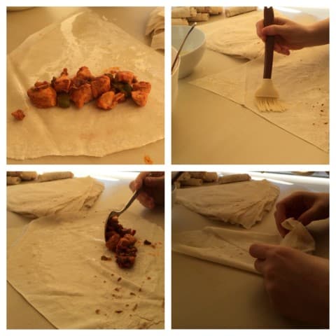 - Yufkalari 6 eşit parçaya bölün. Sıvı yağ ile yağlayarak tavuklu harçtan koyun ve sarın. Bütün yufkayı bu şekilde hazırladıktan sonra tepsiye yerleştirin ve üzerini bıçakla oyun. Oyduğunuz kısımlara kirmizi biber ve yeşil biber koyun. Yumurta sarısı sürüp 180 derecelik fırında pişirin.