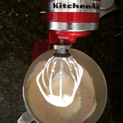 - Yumurtaların sarısı ile beyazını ayırın. Bir kaba yumurtaların beyazını koyup, toz şekeri de ekleyerek krem şanti kıvamına gelene kadar çırpın. Ardından yumurta sarılarını ekleyerek biraz daha çırpın. Un, kabartma tozu ve vanilyayı eleyerek karışıma dahil ederek bir süre daha çırpın.